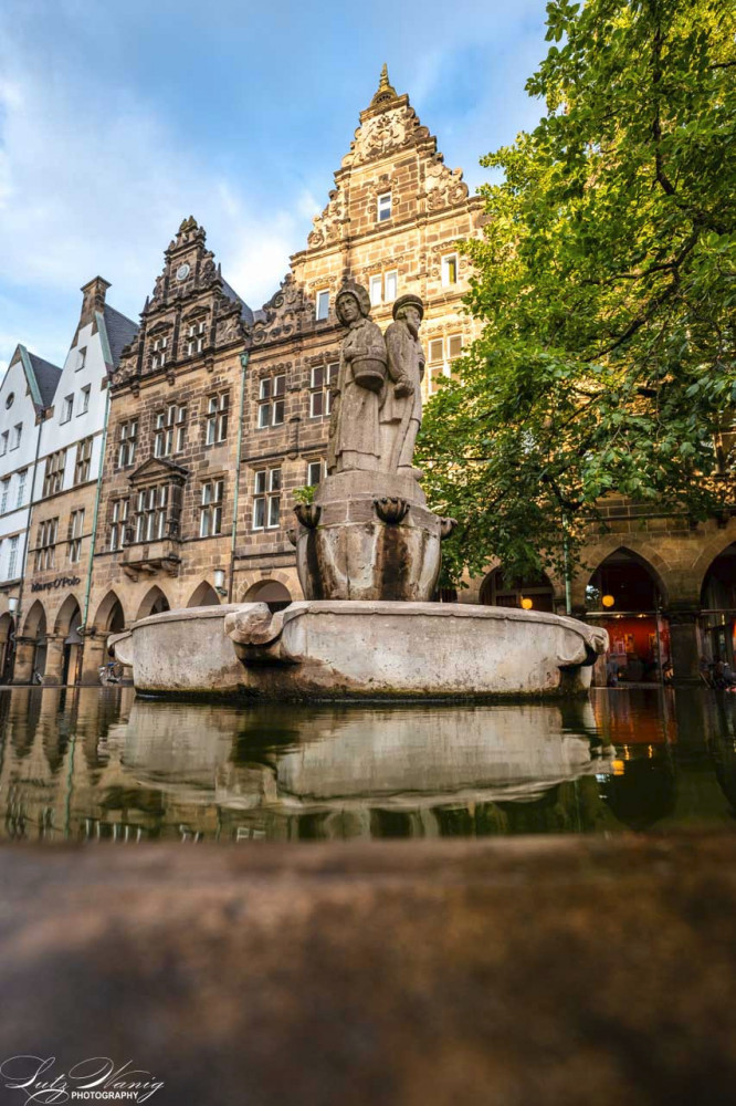 Er wurde 1956 von Heinrich Bäumer junior geschaffen und ersetzt einen Vorgängerbrunnen, der im Zweiten Weltkrieg zerstört wurde. Der Brunnen zeigt eine bäuerliche Familie und symbolisiert die ländliche Bevölkerung der Region. Direkt neben dem Brunnen steht die imposante Lambertikirche, bekannt für die Käfige am Turm, die an die Täuferbewegung des 16. Jahrhunderts erinnern. Regelmäßige Sanierungen sichern den Erhalt des Brunnens, der ein lebendiger Teil der Münsteraner Innenstadt bleibt.